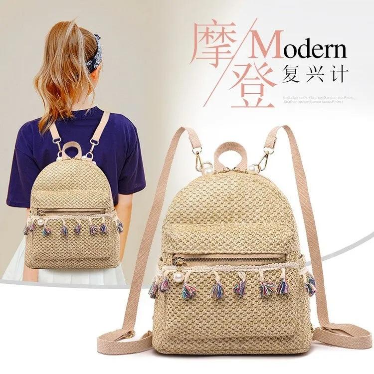 Straw Women Backpack Weave Tassel Summer Beach Female Shoulder Bag