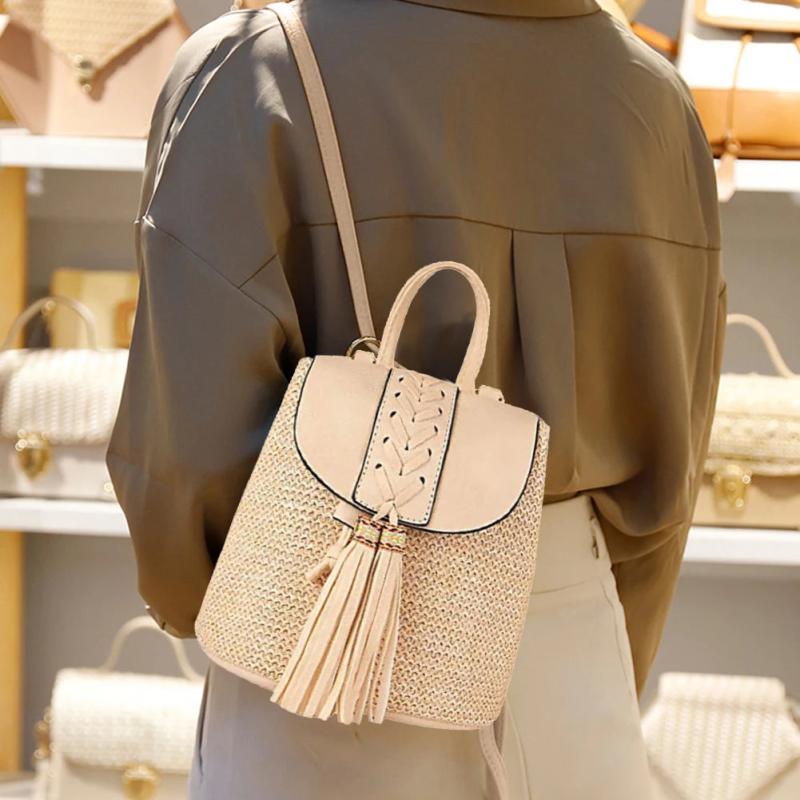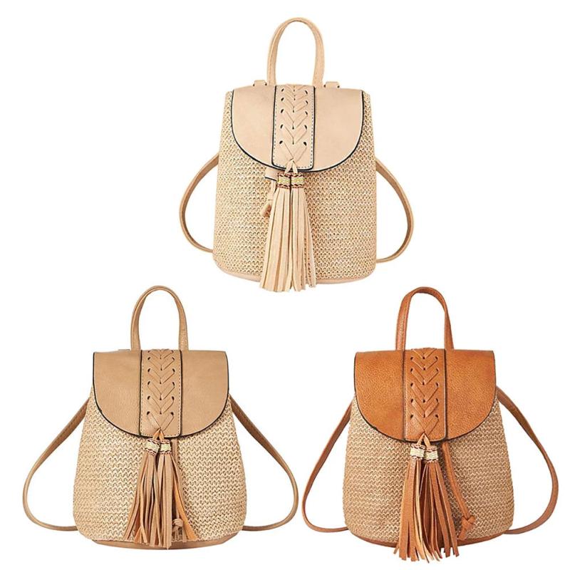 Straw Woven Backpack PU Tassel Travel Shoulder Bags