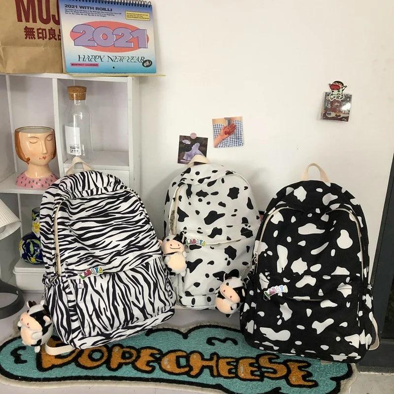 This trendy and fun backpack is perfect for campus students with its unique cartoon cow print design. Stay organized and stylish with this spacious daypack.