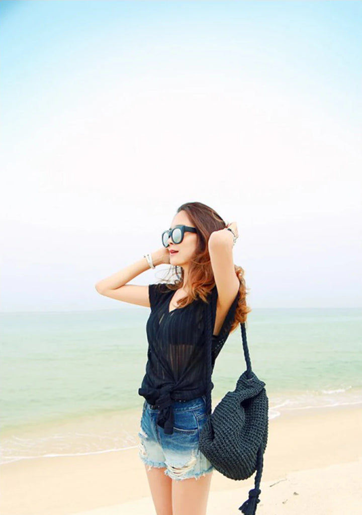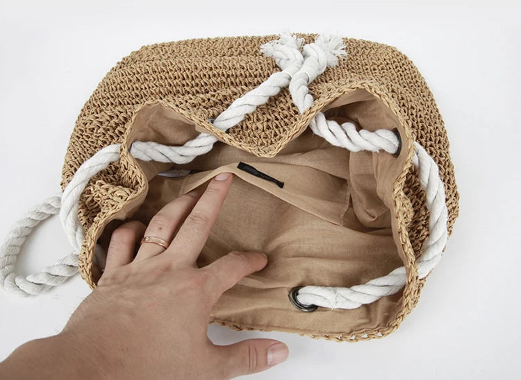 This stylish straw backpack is perfect for summer outings, beach days, or travel. It features a drawstring closure and knitted design for a trendy look.