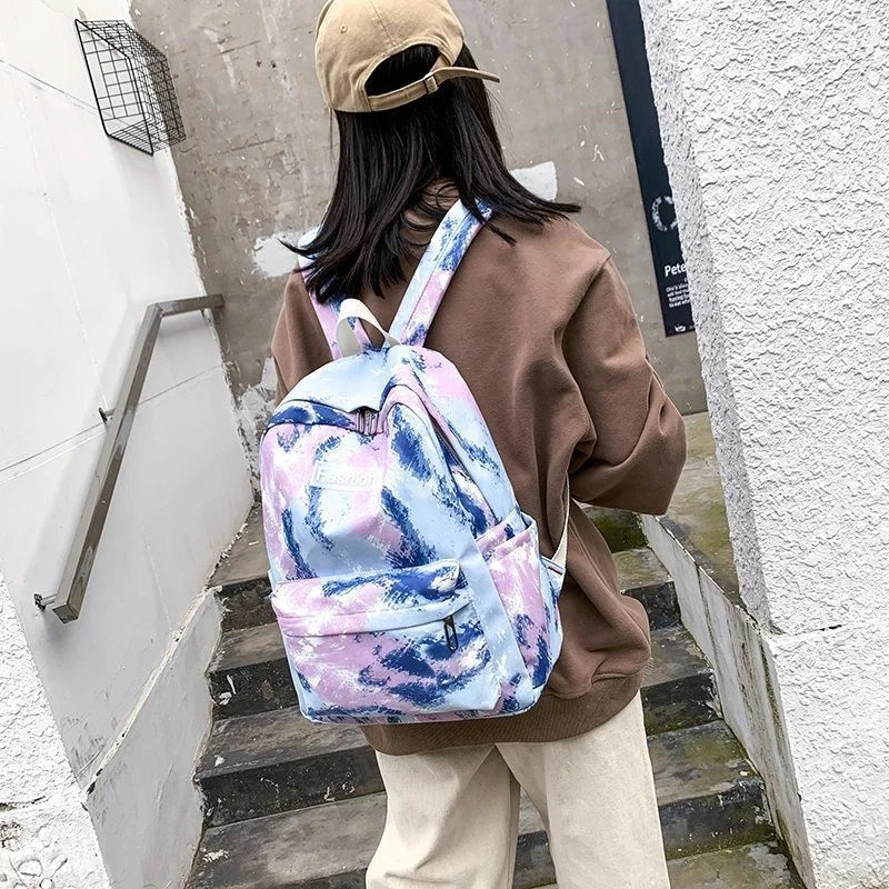 This fashionable tie-dye backpack is perfect for women on the go. It features a large capacity for all your essentials and multiple pockets for organization. Ideal for travel, school, or casual outings.