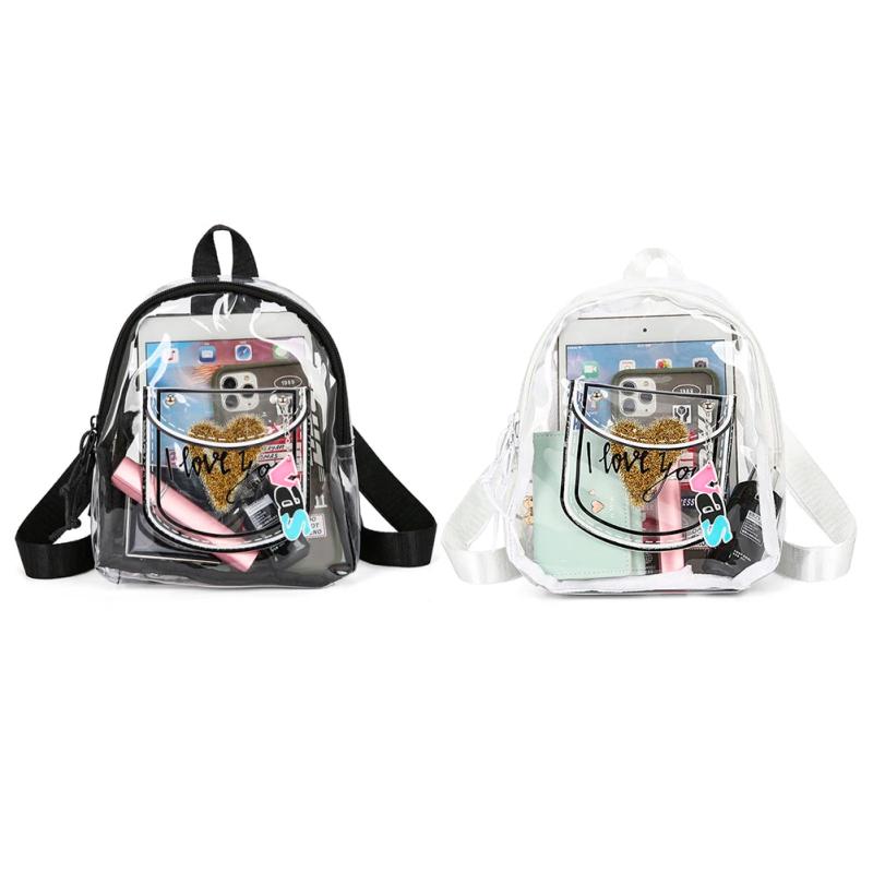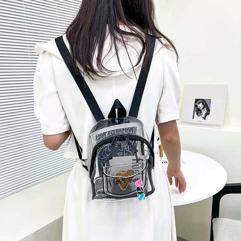 Description:Stay stylish and organized with this fashionable transparent backpack. Made of waterproof PVC, it features a lovely letter love decoration ideal for students.Features: Waterproof PVC material for durability Transparent design for easy visibility of contents Ideal size for students and daily use Fashionable letter love decoration adds a trendy touch...