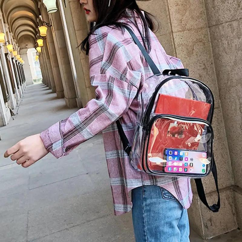 Stay stylish and organized with this transparent backpack made of durable PVC material. Perfect for travel, school, or everyday use, it features dual shoulder straps for comfortable carrying and a large capacity to hold all your essentials.