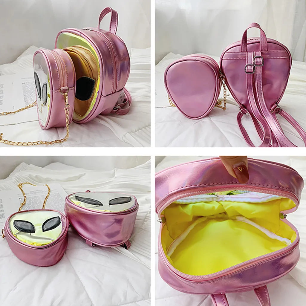Stay stylish with this transparent jelly backpack that features an alien design. Perfect for women, children, and teens. The versatile design includes multiple pockets and compartments.