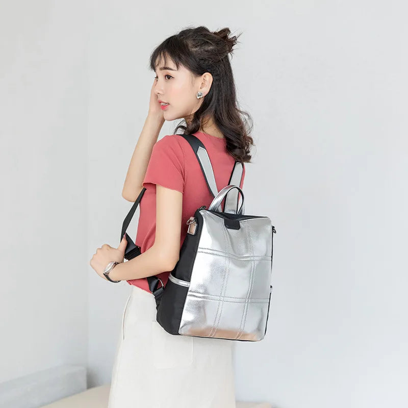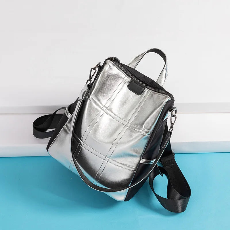 This vintage school shoulder backpack is made of high-quality silver reflective leather. It is perfect for women and teenage girls.