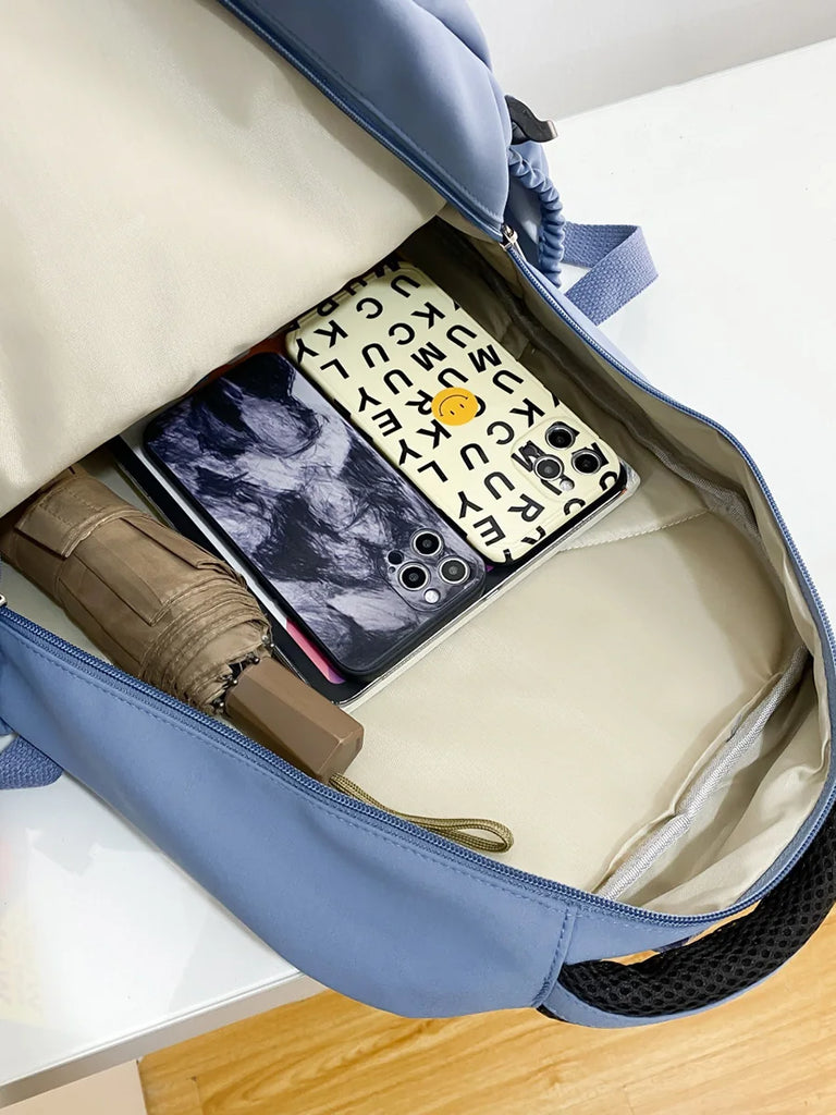 Stay stylish and organized with this waterproof nylon backpack designed for female students. Perfect for school or travel, this backpack has multiple pockets and a trendy design.