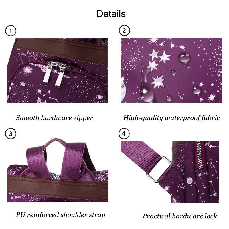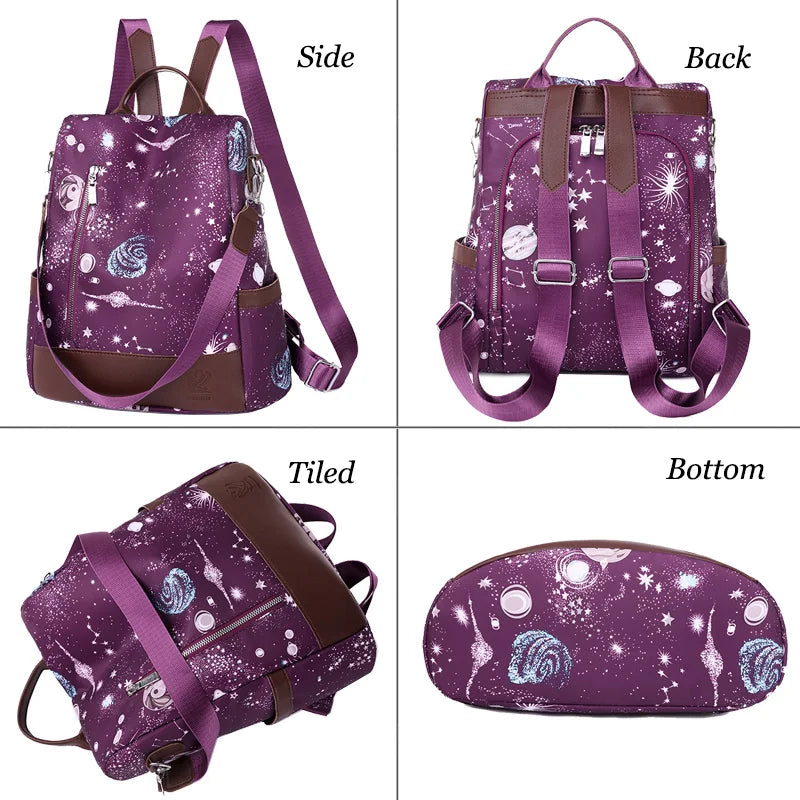 Stay stylish and organized with this anti-theft women's backpack featuring a starry sky print. Made of oxford material, this backpack is perfect for school or everyday use.