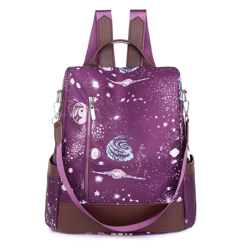 Stay stylish and secure with this Oxford waterproof backpack featuring a starry sky design. Perfect for students, it offers anti-theft features and ample storage.