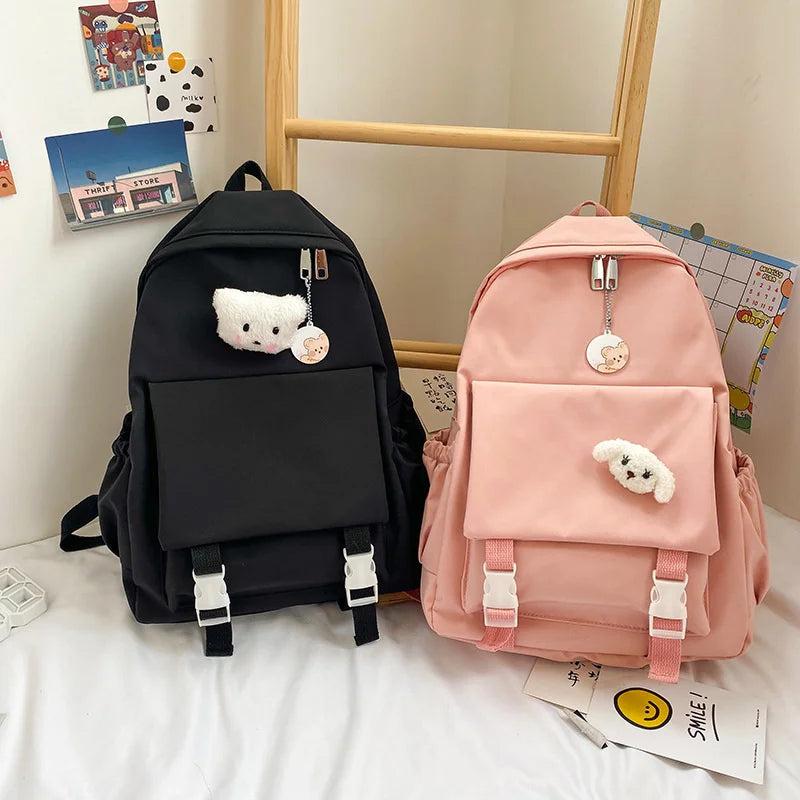 This stylish backpack with pendant is perfect for female students, featuring a waterproof design and suitable for carrying laptops. Ideal for college or travel.