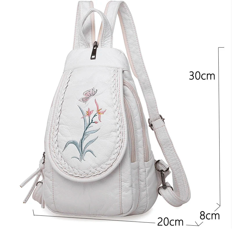 Women Backpack School Bags for Teenage Girls Leather Embroidery Flowers