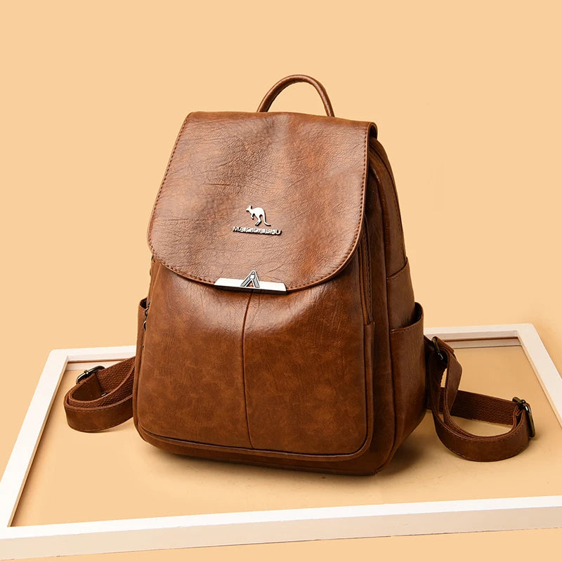 This women's backpack is made of high-quality soft leather, offering ample storage for travel essentials. It serves as a versatile tote bag perfect for various occasions.