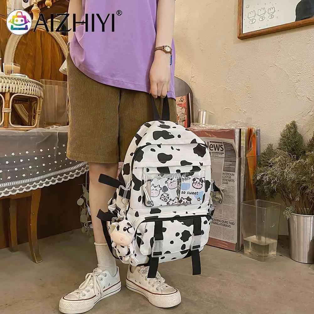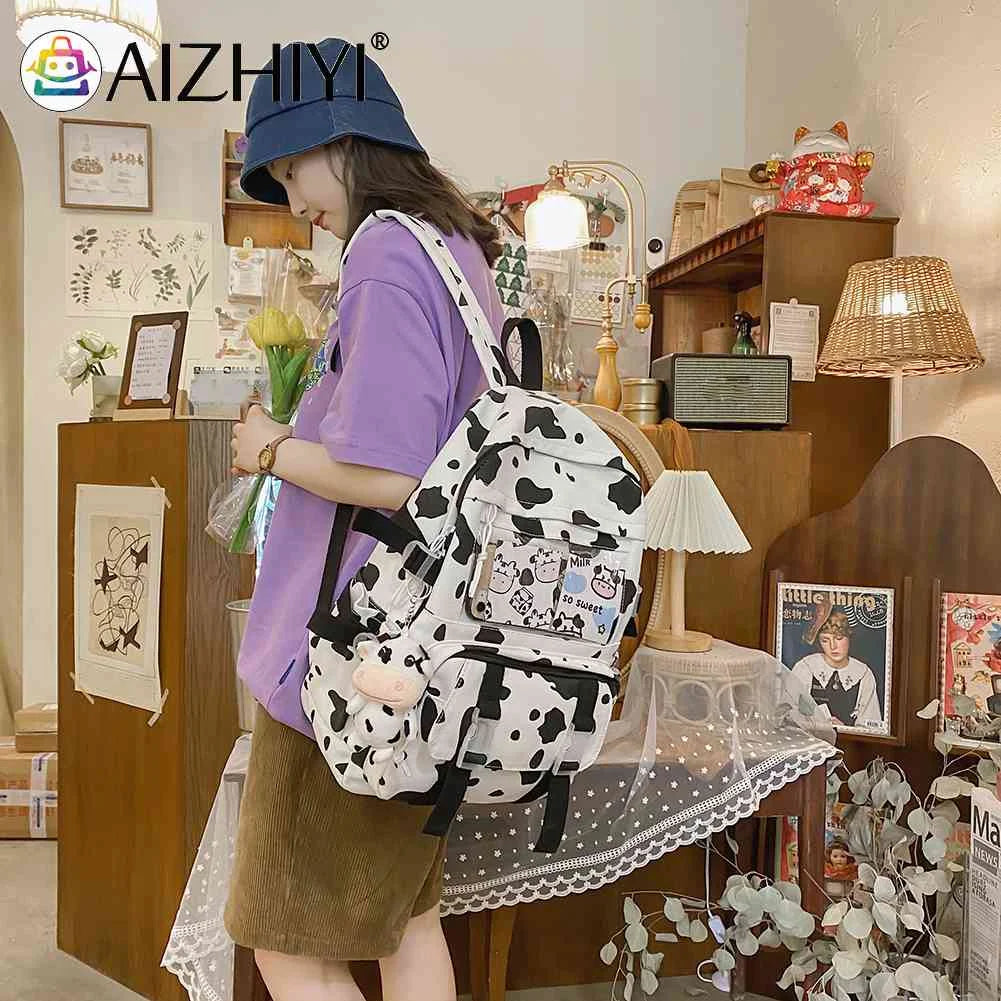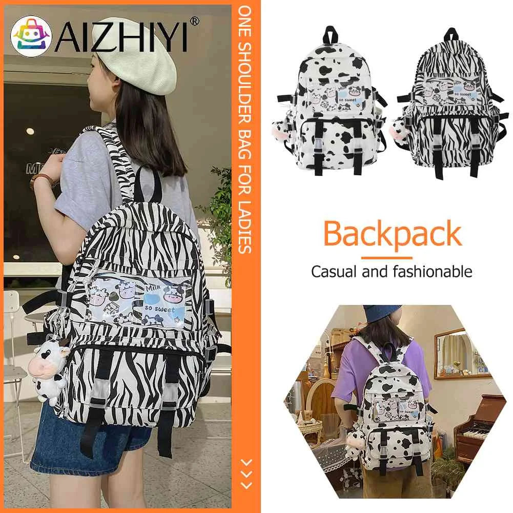 This women's canvas backpack features a cow printing design for a funny and unique style. It has a large capacity and pendant for added charm.
