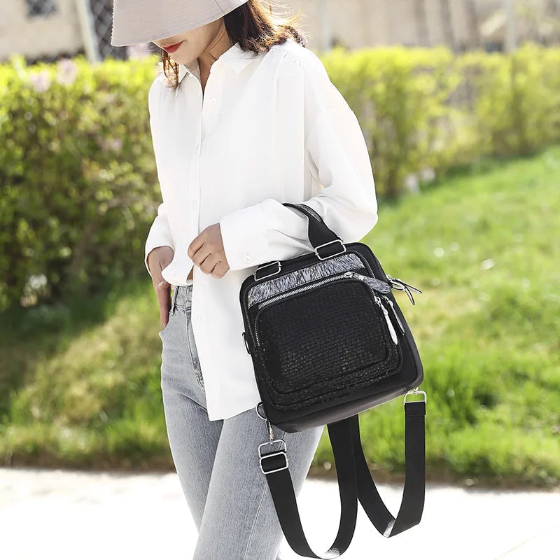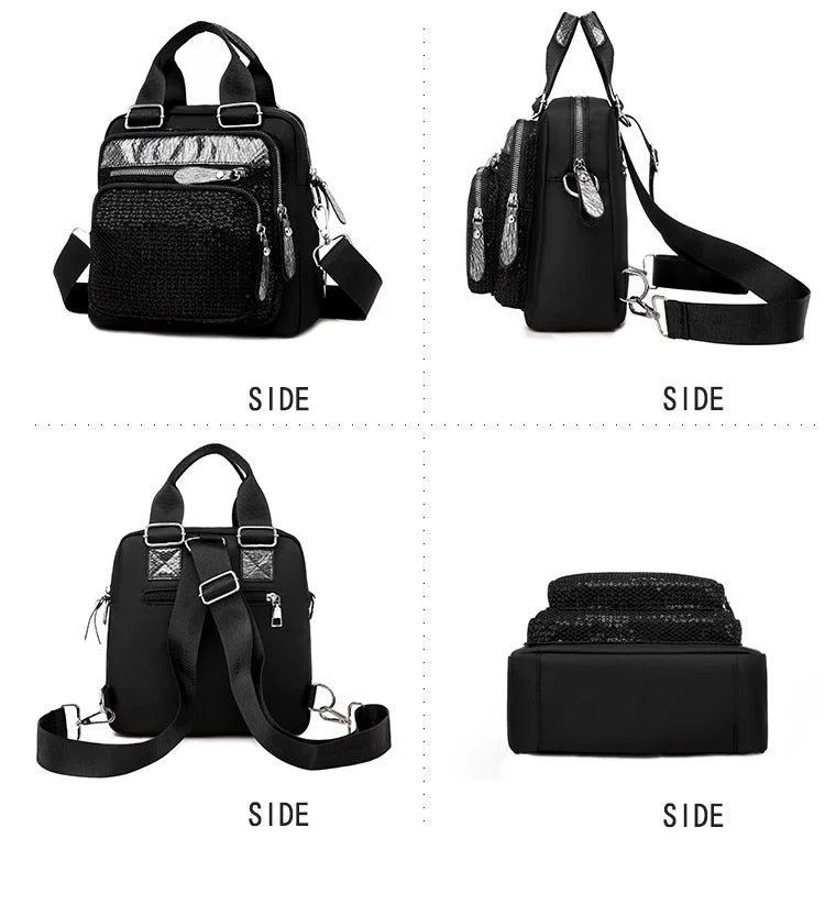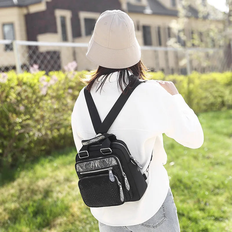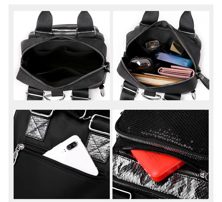 This stylish women's backpack is made of durable nylon, perfect for college and travel. It offers multifunctional use and features a comfortable shoulder strap.