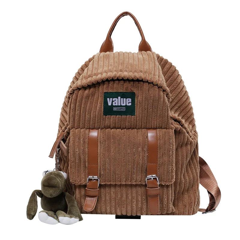 Women Corduroy Backpack Striped Soft Cloth Bags Leather Strap School Bookbag