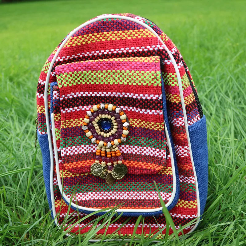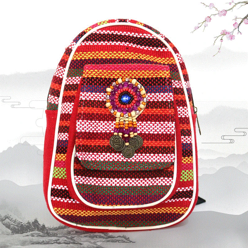 This women's canvas backpack features ethnic embroidery, large capacity for travel, and casual outings.