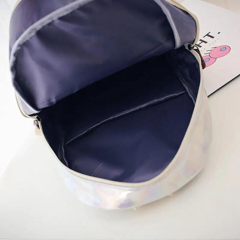 This PU Leather backpack is perfect for school or travel. The holographic design adds a fun and stylish touch. Available in silver or pink.