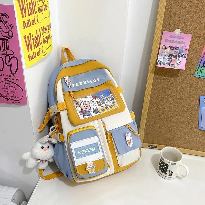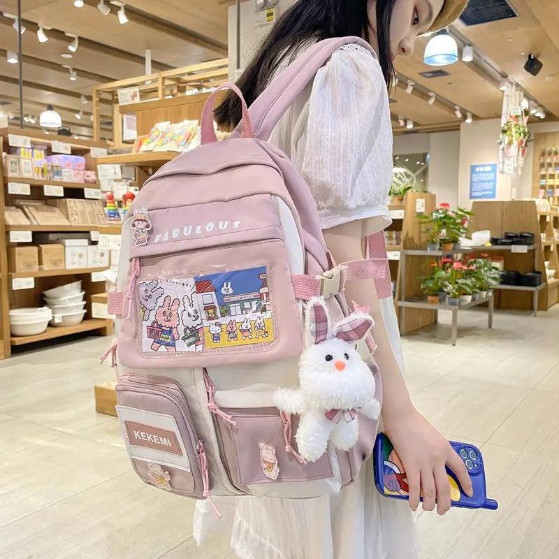 Description:This large-capacity backpack is perfect for female students and girls. It comes with multiple pockets for organizing books, laptop, and other essentials.Features: Durable nylon material for long-lasting use Adorable rabbit design adds a touch of cuteness Suitable for junior high school students Spacious enough to carry a laptop and books...