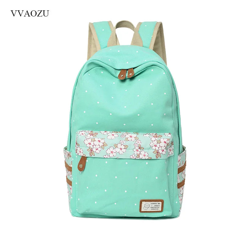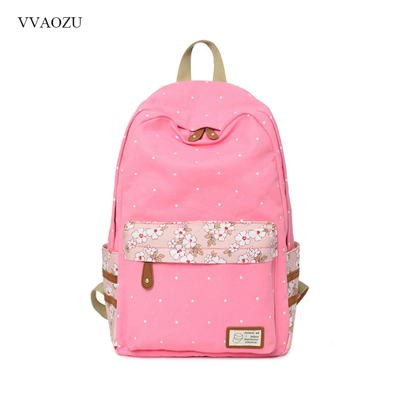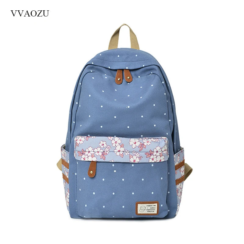 Women Polka Dots Canvas Laptop Backpack Floral Patchwork Rucksack