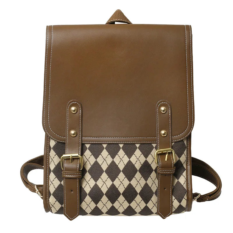 Women Retro Pu Plaid Backpack Large Capacity Student Magnetic Buckle School Bag