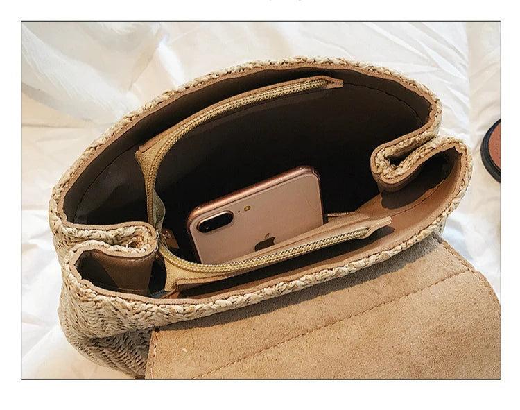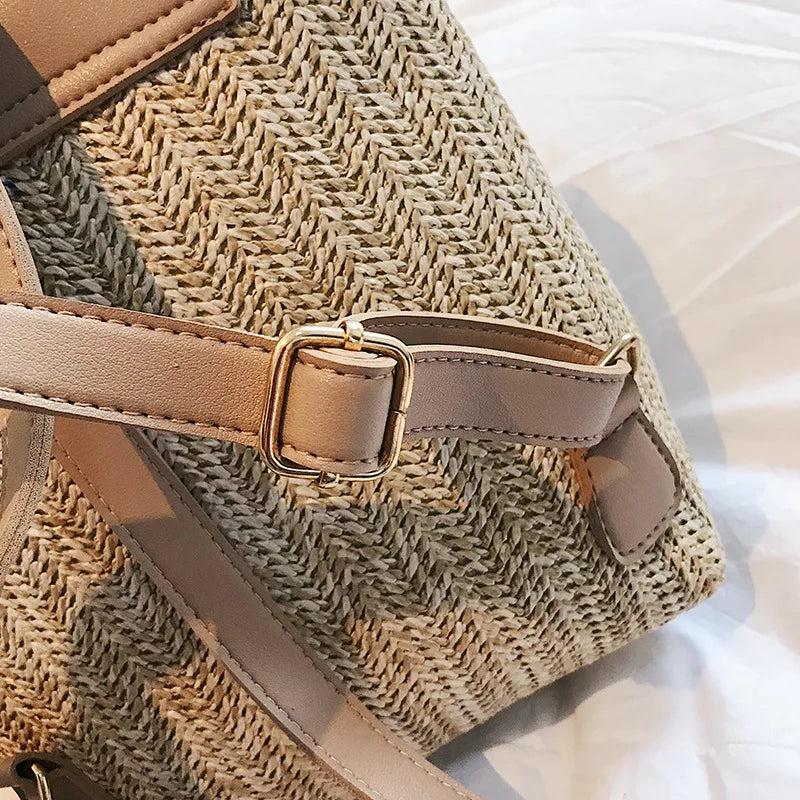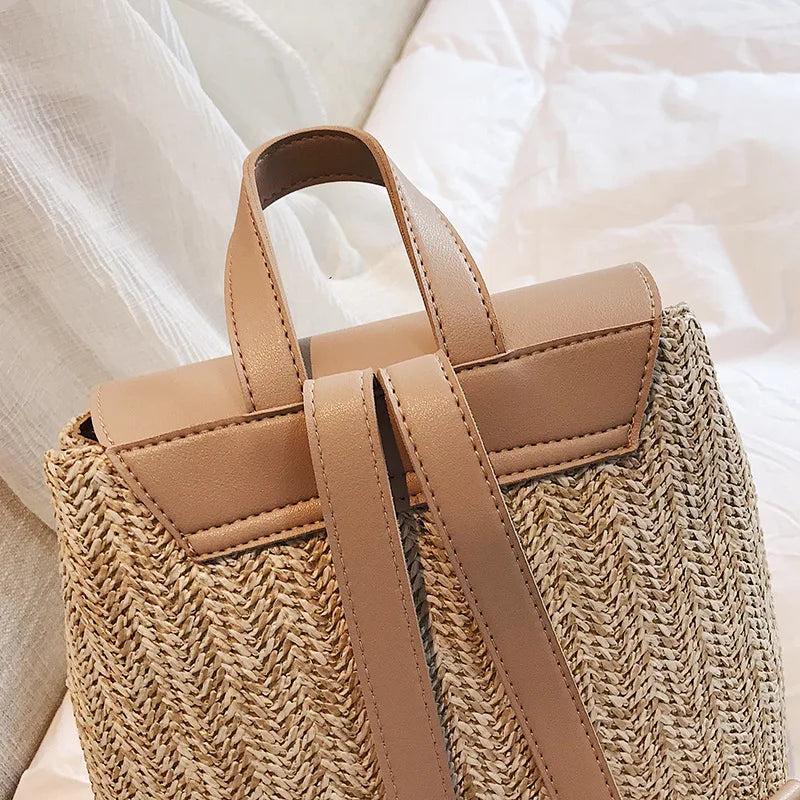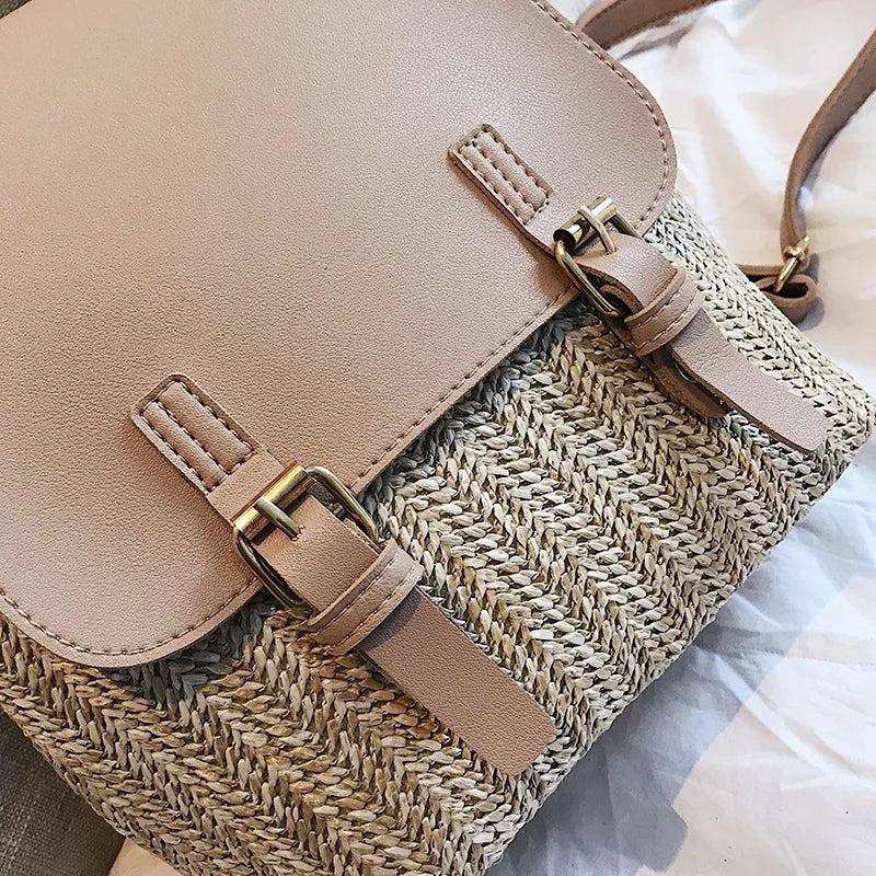 This stylish backpack purse features a woven design with a touch of Mori girl aesthetic. It's perfect for women looking for a compact yet fashionable bag.