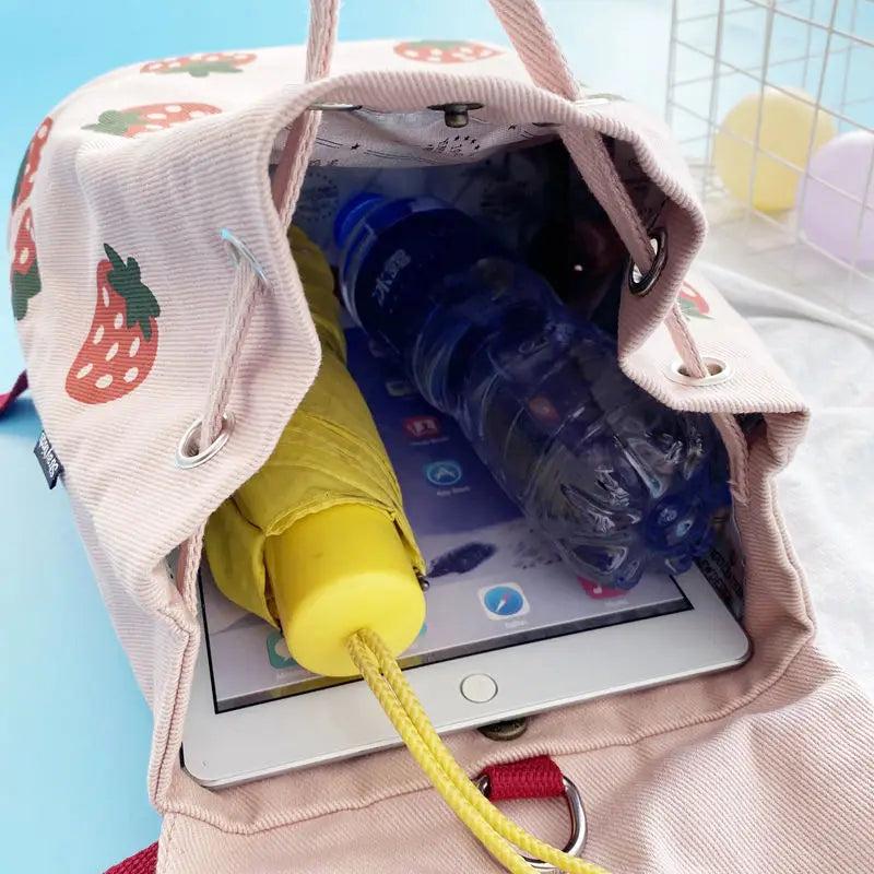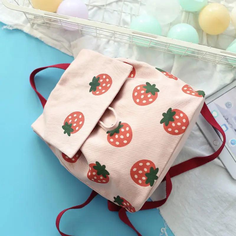 Casual and sweet backpack featuring strawberry print, ideal for students. Made of durable canvas with large capacity for travel.