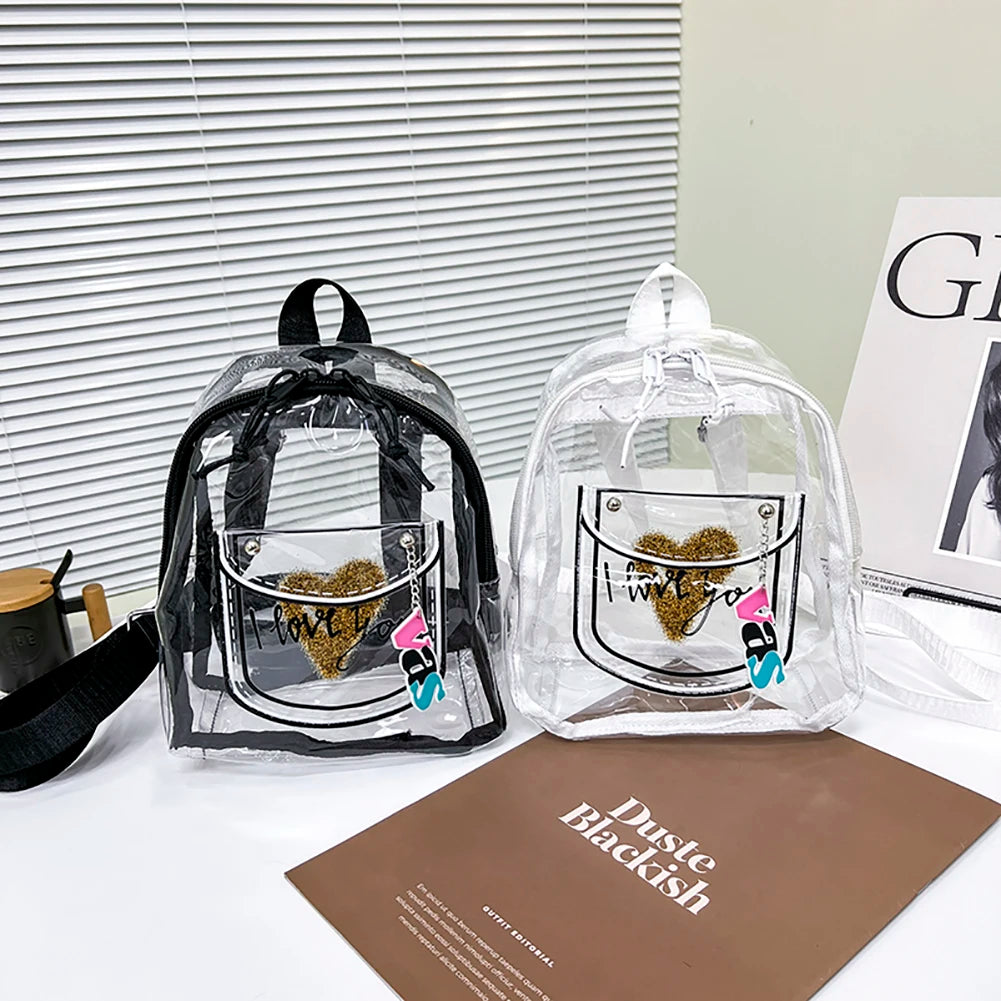 Women Transparent Backpack Love Print PVC Waterproof Clear Travel Shoulder