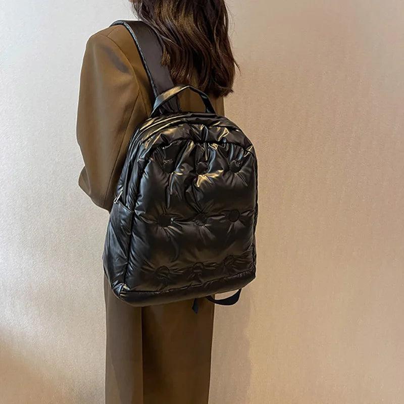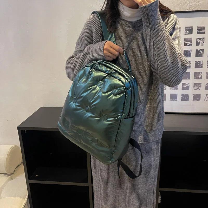 Stay stylish and organized with this women's backpack made of space cotton, perfect for students. It has a big capacity to hold all your essentials and features a down shopper design. Ideal for winter trips and travel.