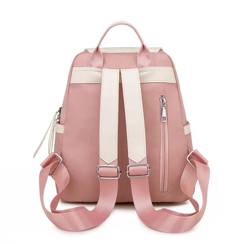 This women's backpack is perfect for casual travel or school. It features a stylish design in pink and green colors.