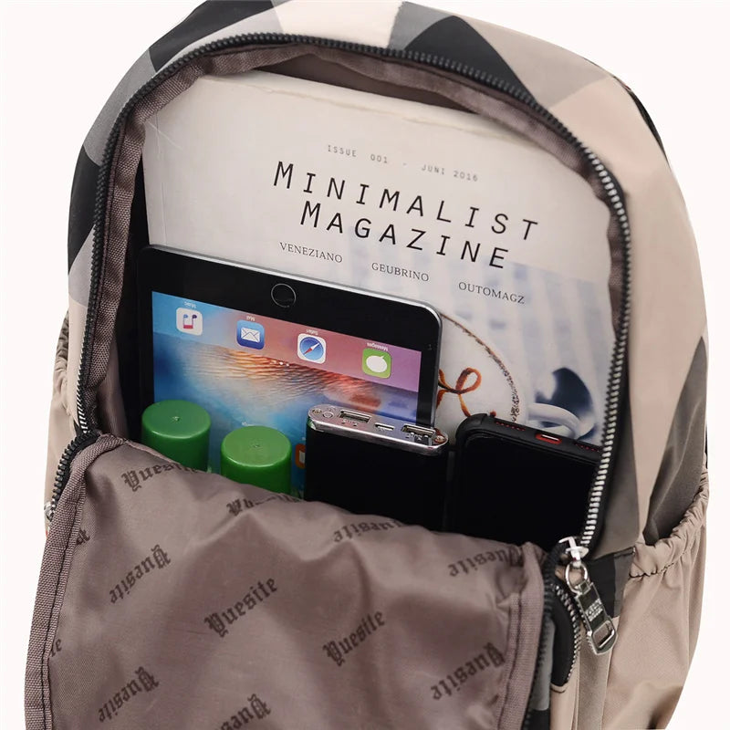 This stylish backpack is perfect for travel, leisure, or everyday use. It features a spacious interior, waterproof nylon material, and a trendy plaid design.