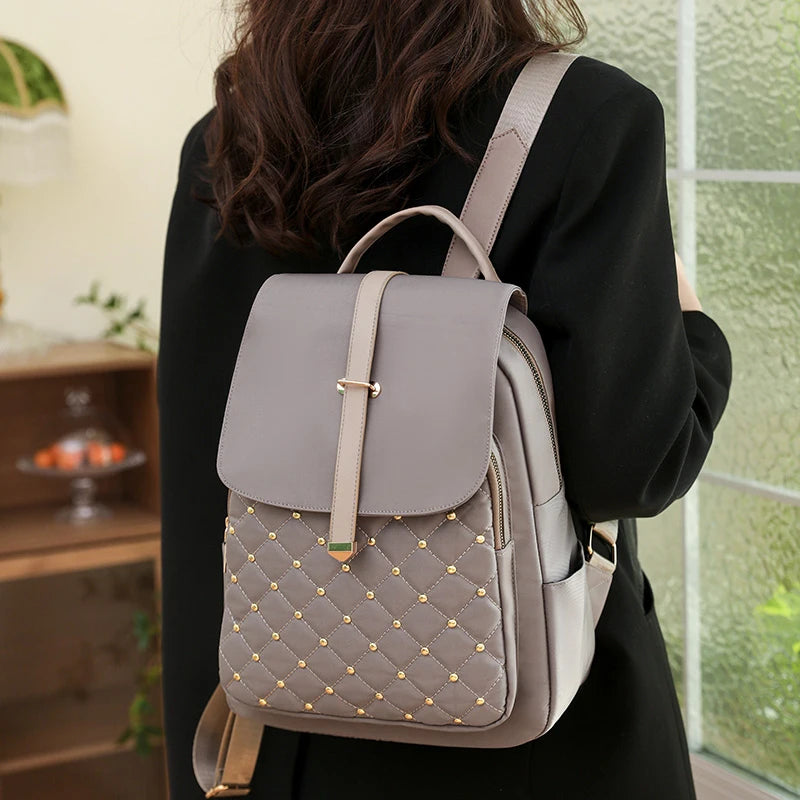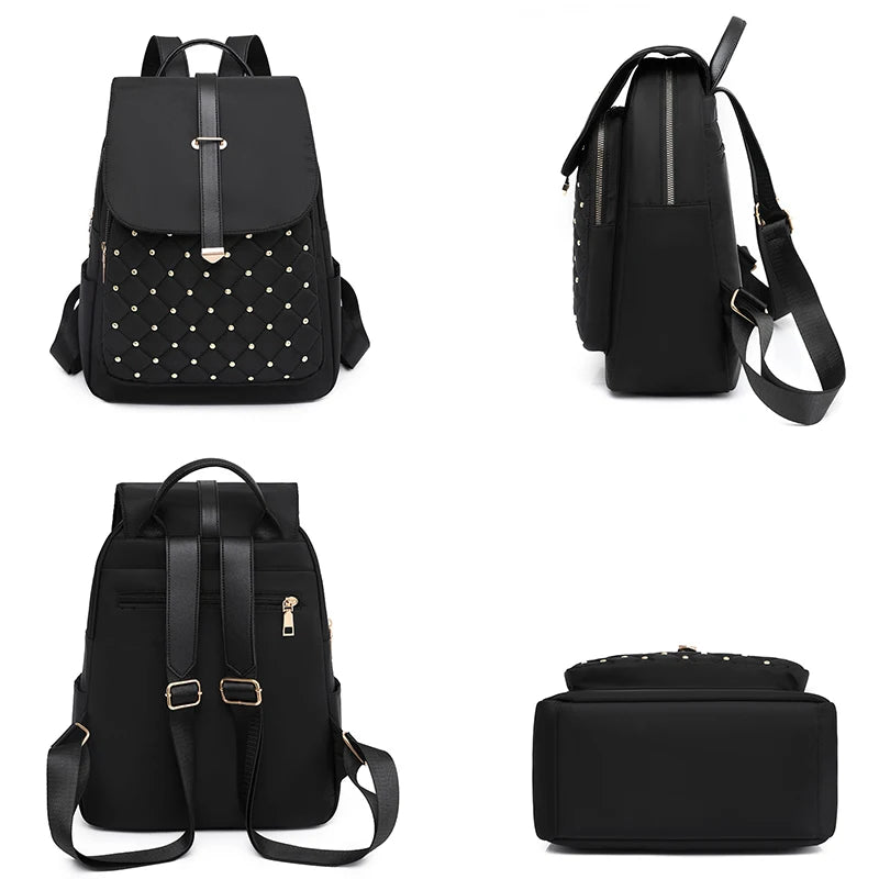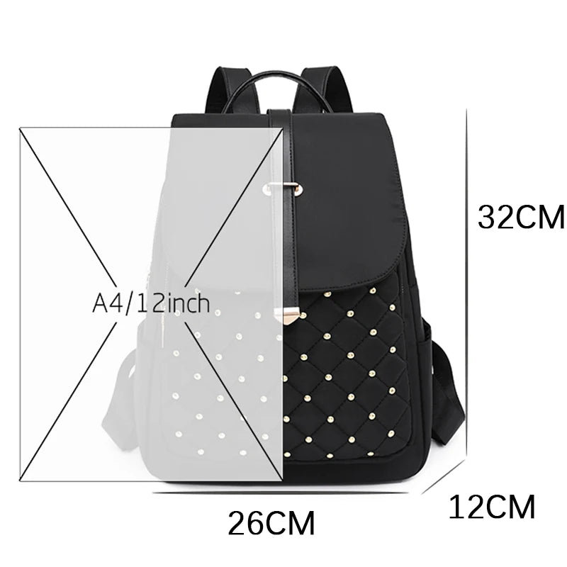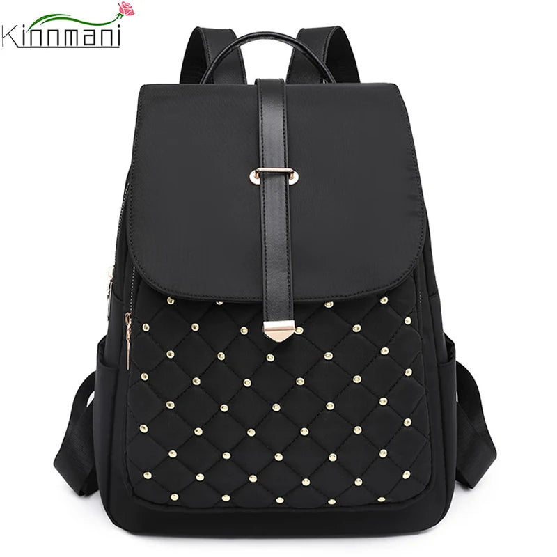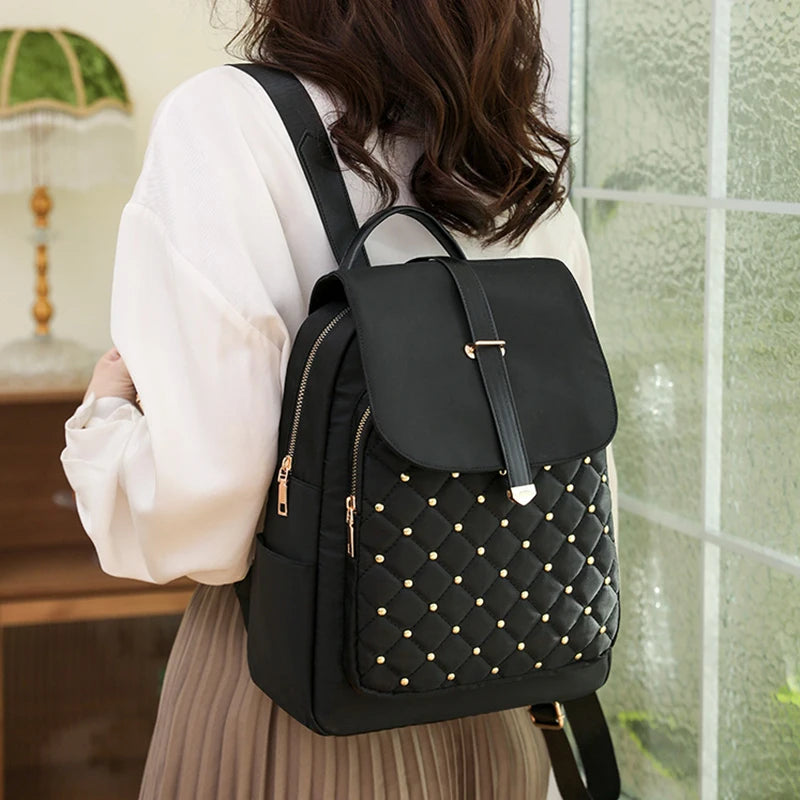 This riveted backpack is made of durable nylon and designed for women. It features a large capacity, anti-theft properties, and serves as a practical and stylish option for leisure activities.