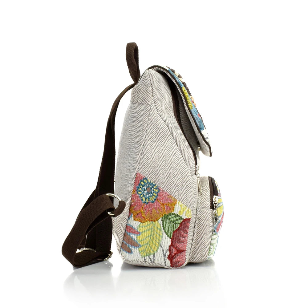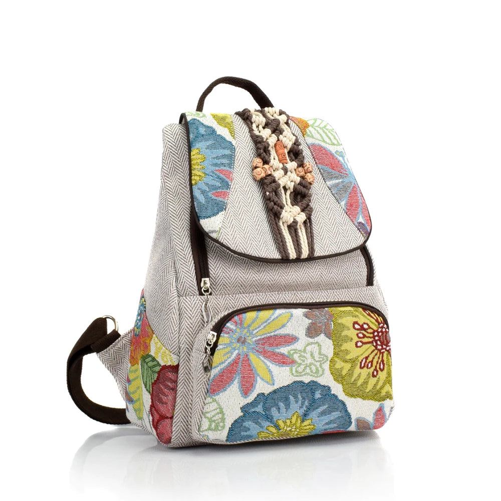 This light grey women's small canvas backpack features a beautiful floral embroidered design, making it both stylish and functional. It is perfect for everyday use or for a casual outing.
