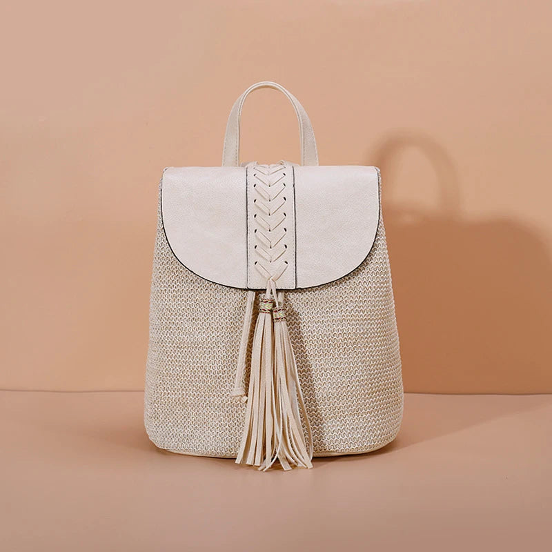 Get ready for summer with this stylish women's backpack made of straw, perfect for travel, beach outings, and everyday use. The weaved design adds a trendy touch to your look.