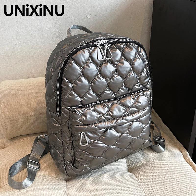 Stay stylish and organized with this rhombus quilted women's backpack, perfect for winter adventures. It features a large capacity and durable design to carry all your essentials.