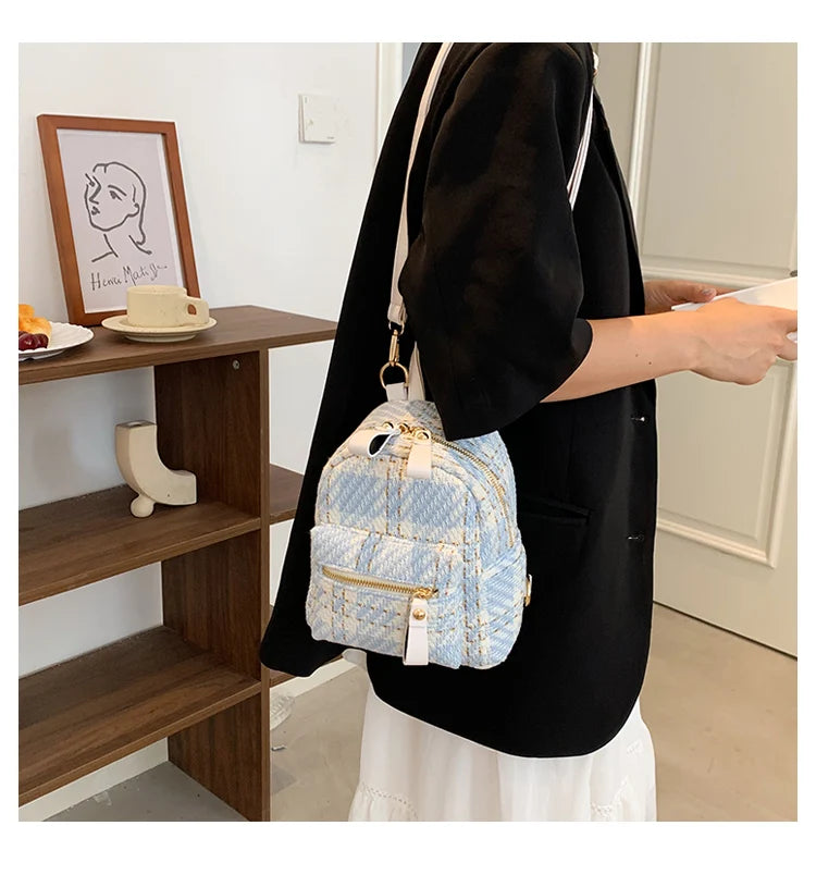 Wool Plaid Women Backpack Small Multifunction Shoulder Bags Lady Back Pack