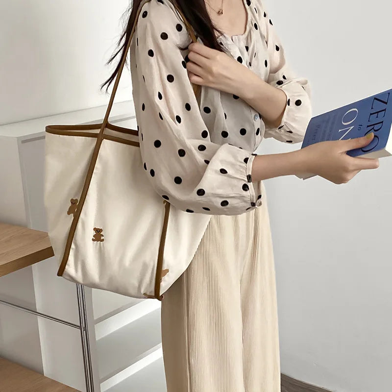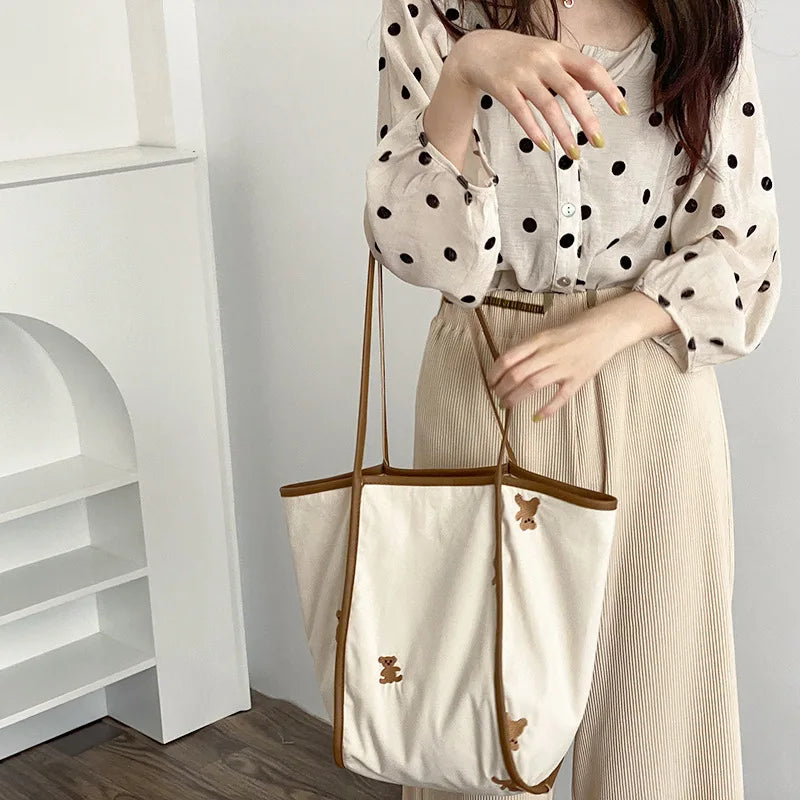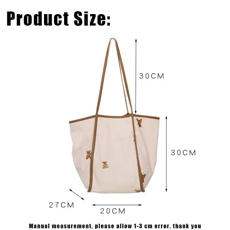This canvas shoulder bag features a cute bear embroidery design, perfect for shopping, carrying books, or as a reusable grocery tote. Made from cotton cloth for durability and eco-friendliness.