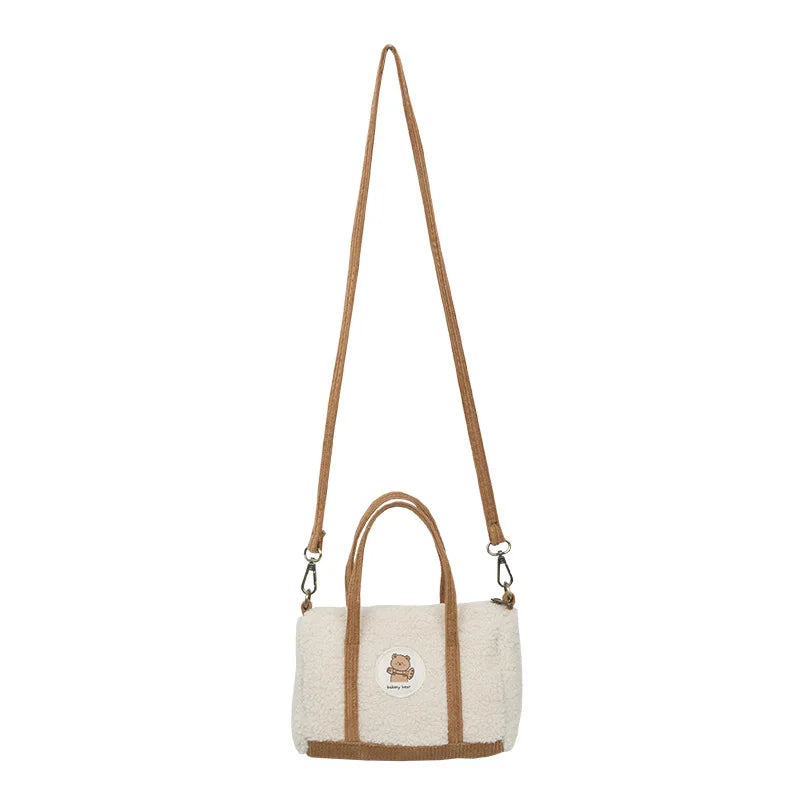 This adorable Bear Women Boston Bag is made of woolen corduroy material with a plush design. It features a small handbag design, ideal for girls. The bag has a cloth zipper purse and can be worn as a shoulder bag or crossbody bag.
