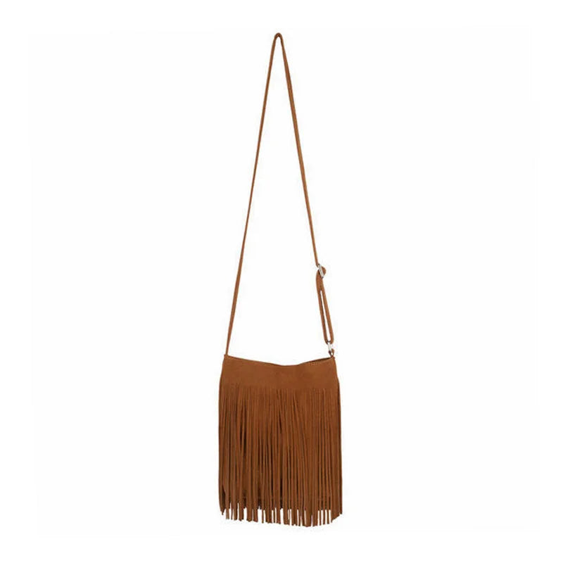 Stay on-trend with this small bohemian bag featuring fringed tassels. Made of frosted PU leather, this vintage-inspired purse is perfect for everyday use. Wear it as a shoulder or crossbody bag.