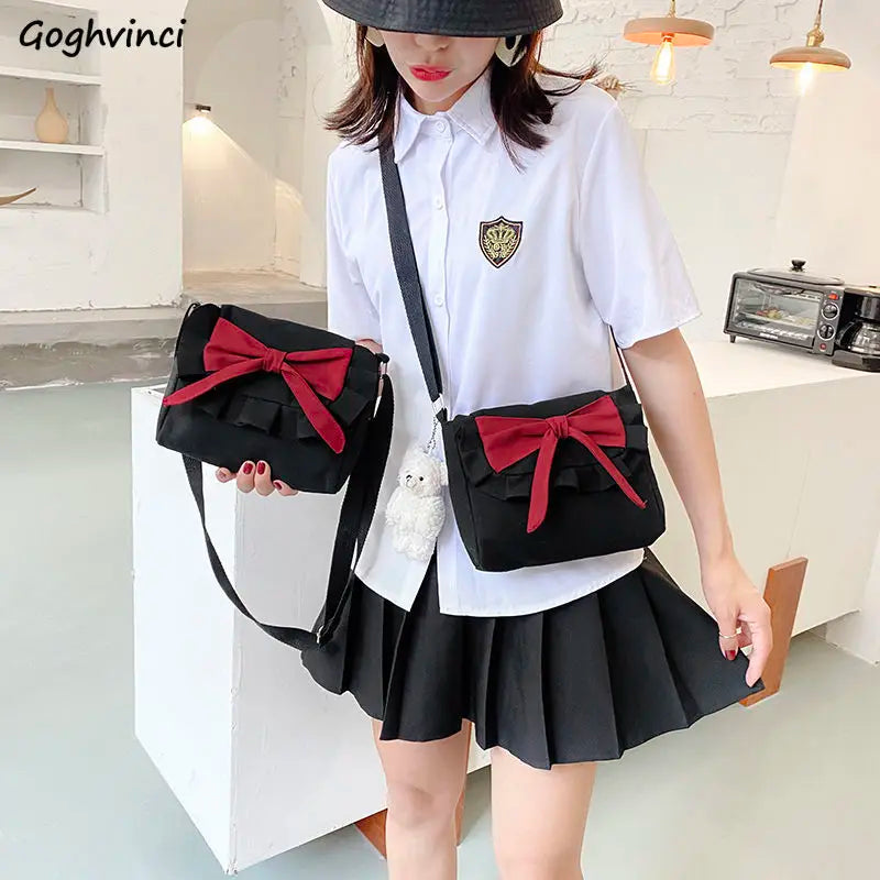 Canvas Japanese Preppy Style Shoulder Bag with Bow