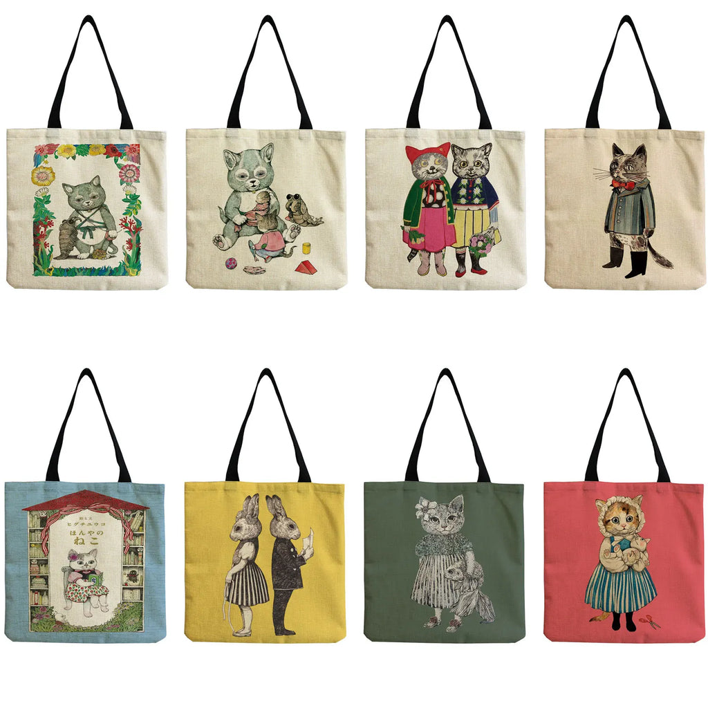 This Japanese style illustration handbag features a cute cat girl print. It is perfect for women who love unique designs. The bag is a high-capacity, reusable tote that is great for outdoor use or shopping trips.