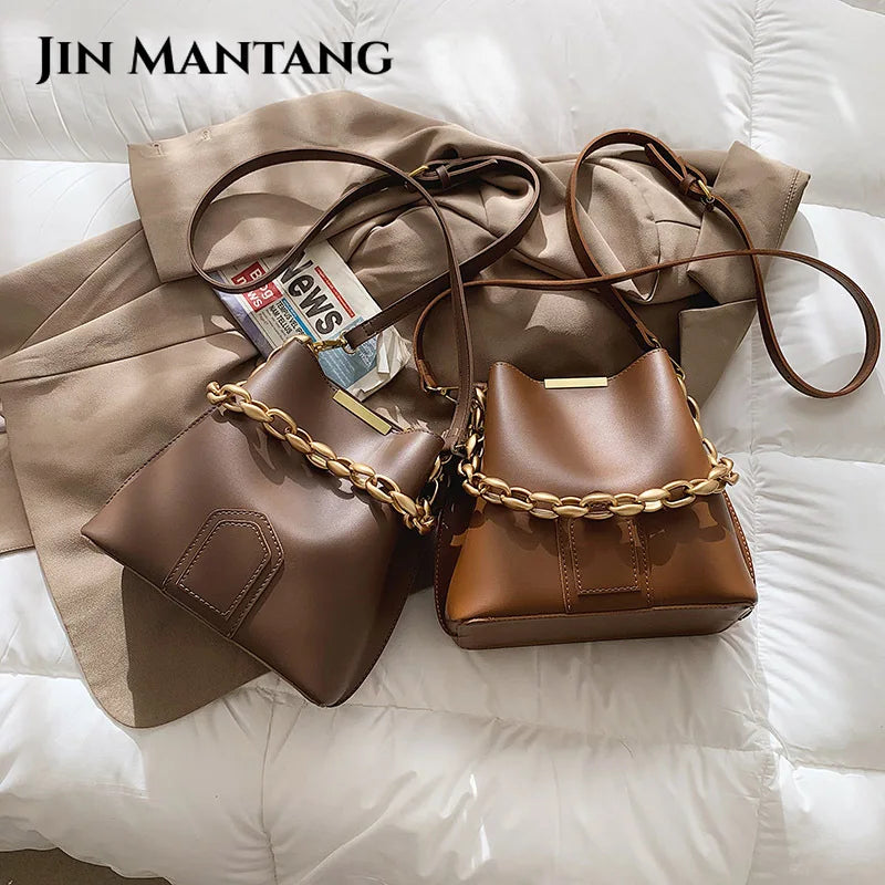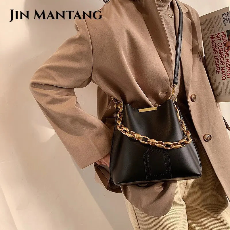Chain Bucket Shoulder Bags Women Handbags Crossbody Totes Solid PU Leather