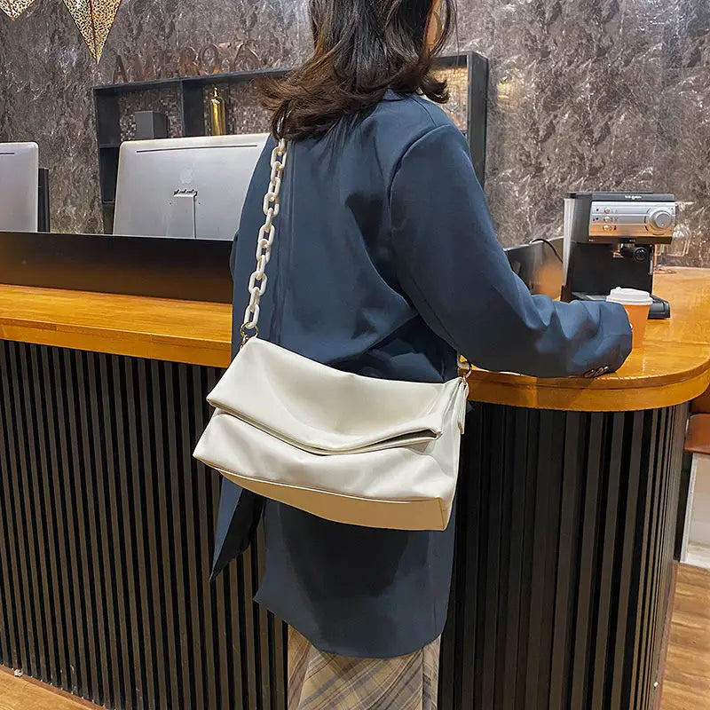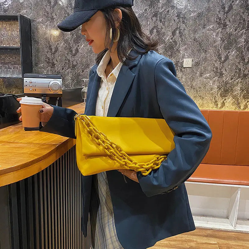 This retro bag is perfect for office ladies with its textured PU leather and elegant design. It features a chain shoulder strap and a convenient envelope style.