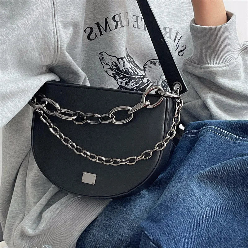 This stylish saddle shoulder bag is made of high-quality PU leather, perfect for everyday use. It features a chain strap and solid color design, making it a versatile accessory for any outfit.