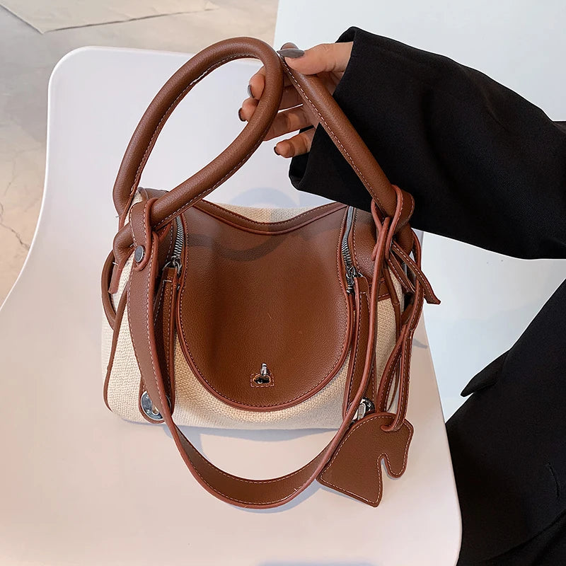 Elevate your style with this classic canvas and PU leather patchwork tote bag. Perfect for everyday use and adds a retro touch to your outfit.