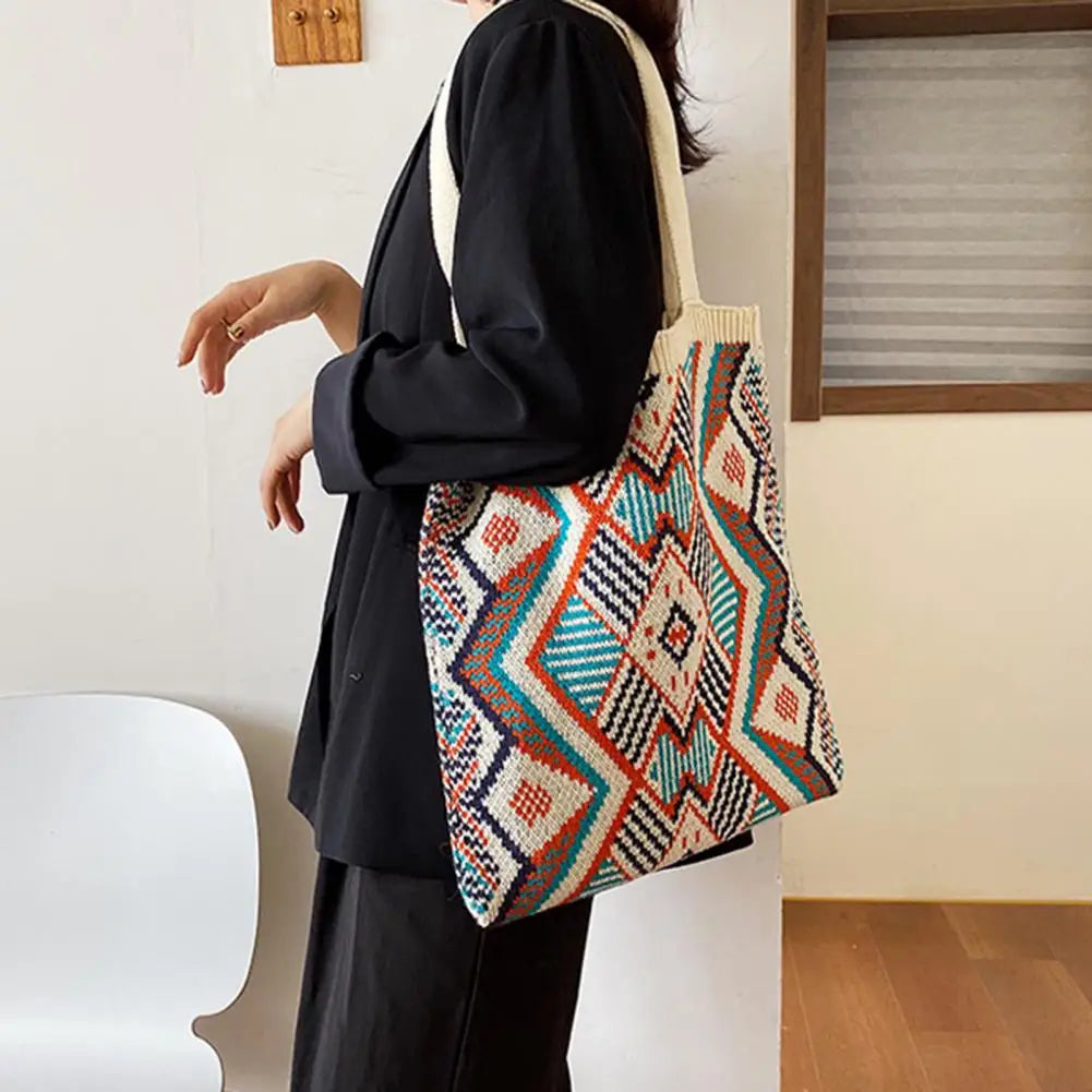 Description:Stay stylish and organized with this large capacity shoulder bag featuring a unique geometric pattern. Perfect for travel and outdoor activities.Features: Spacious design to keep all your essentials in one place Eye-catching colorful geometric pattern adds a trendy touch Ideal for travel, shopping, and outdoor adventures High-quality knitting tote bag...