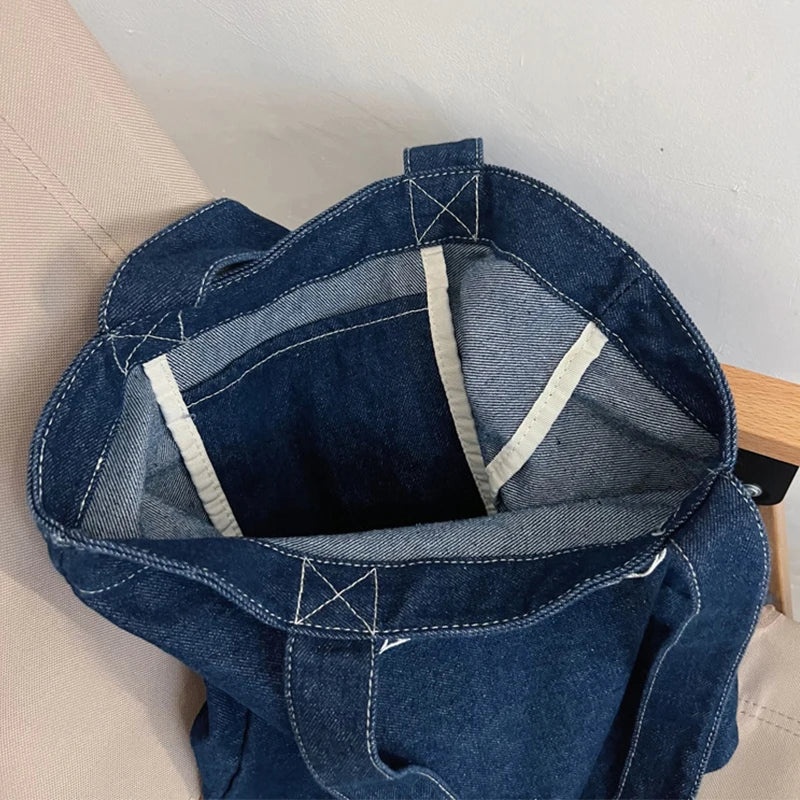 Stay stylish with this denim tote bag featuring large capacity for all your essentials and embroidered letters design. Perfect for everyday use.