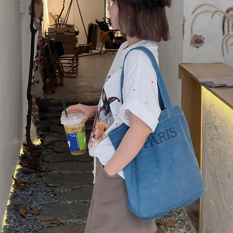 Denim Tote Bag Women Shoulder Bags Embroidered Letters Handbags