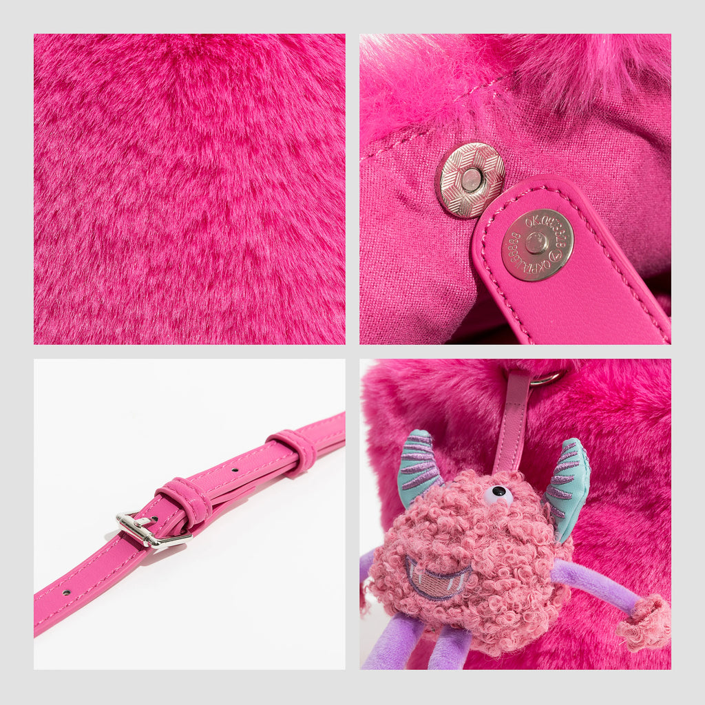 Description:Stay stylish with this cute pink crossbody bag featuring a faux fur design. Perfect for carrying your phone and essentials.Features: Faux fur material with a monster design Small tote bag with top handle Ideal for phone and small items Fashionable and trendy accessory Great for everyday use or special occasions...