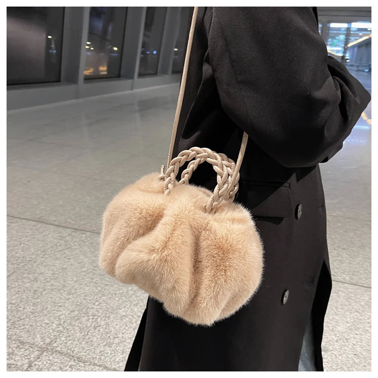 Faux Fur Small Totes With Woven Handle Soft Plush Women's Handbag