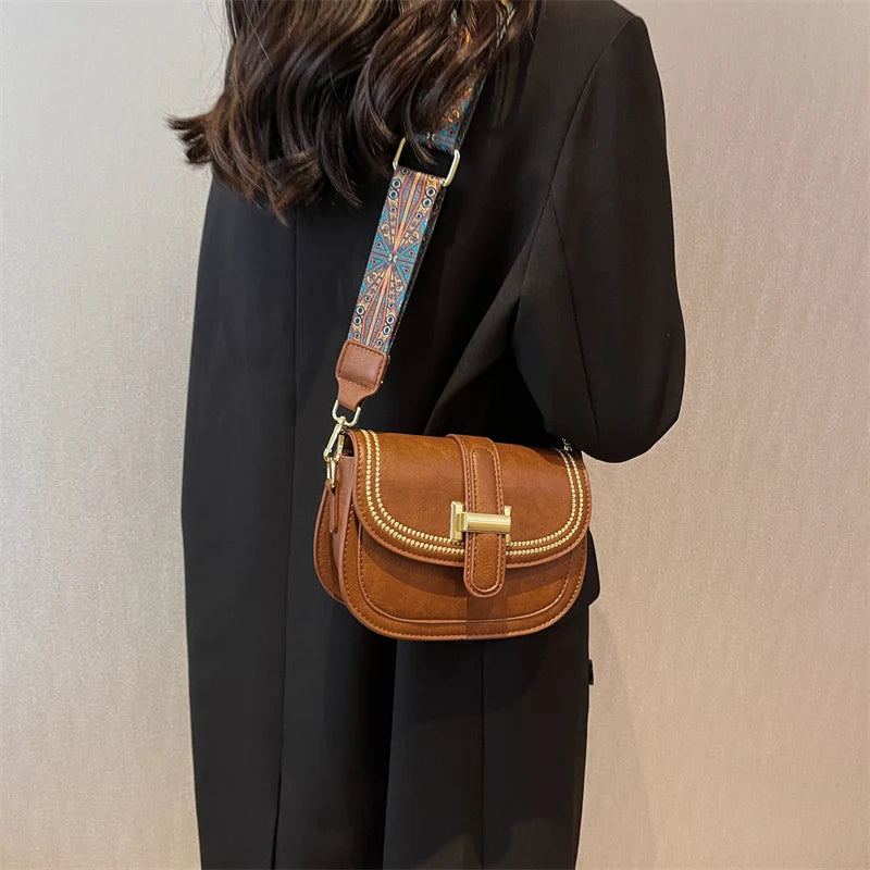 Flap Square Crossbody Bag PU Leather Wide Strap Handbag