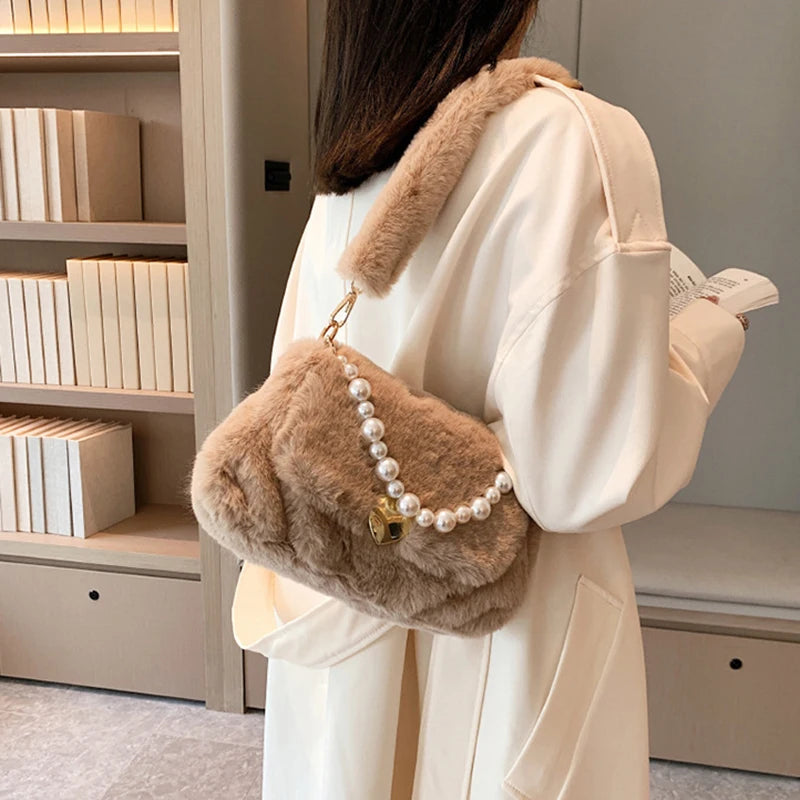 Stay stylish with this plush soft shoulder bag that features a faux pearl chain design. The bag is perfect for adding a touch of elegance to your outfit.